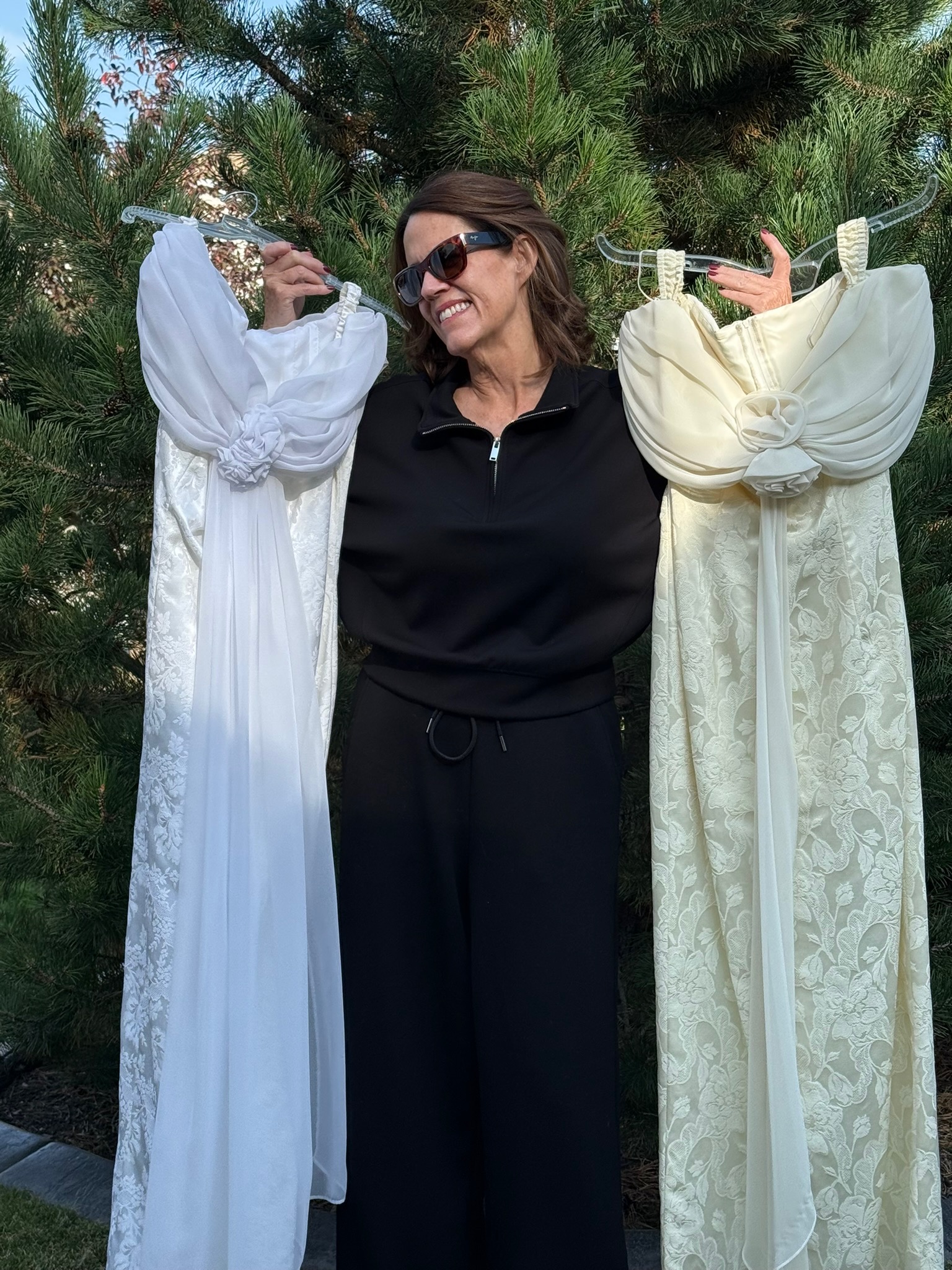 For the record, two dresses set me back a mere $500. When my niece Abby gets married and needs something borrowed, she’ll have a variety to choose from!